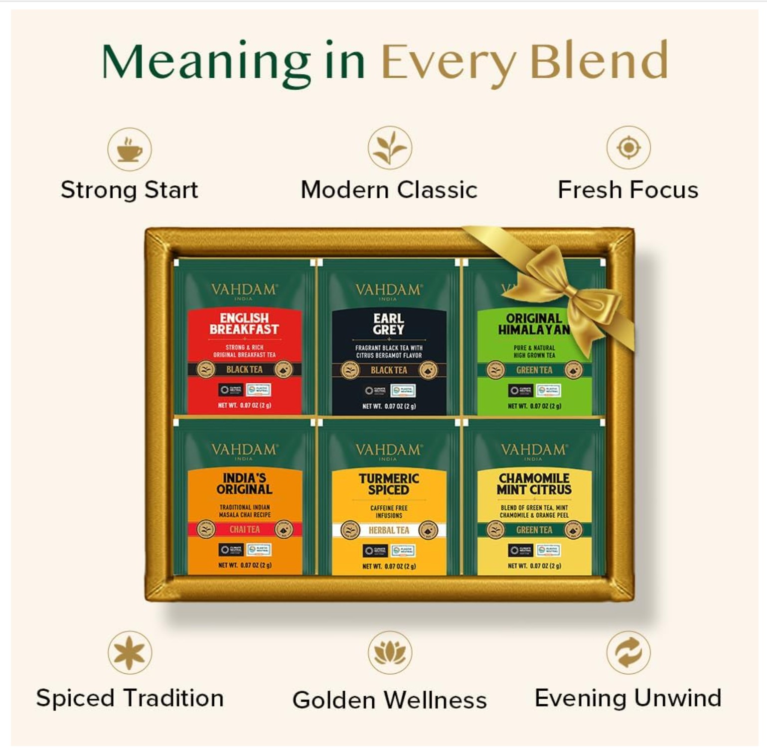 A curated gift set featuring 6 premium tea variants, each in 6 pyramid tea bags, selected by the founder, offering a unique and exquisite tea experience for enthusiasts.