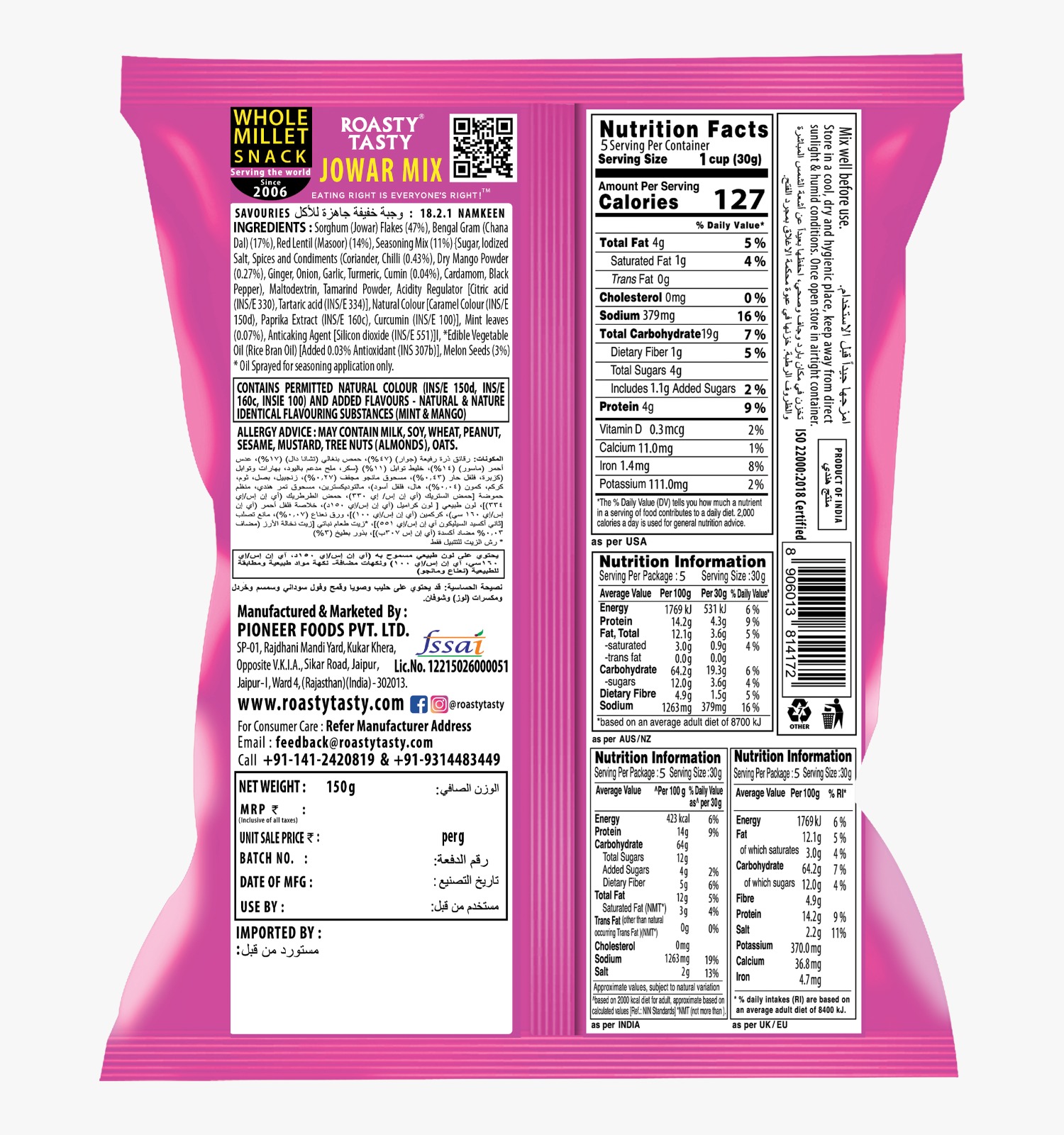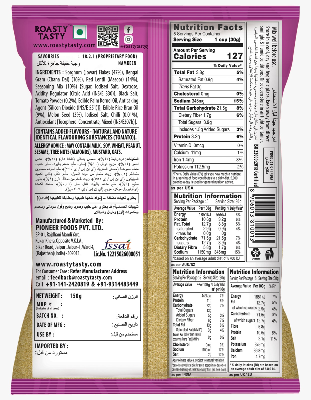 INGREDIENTS: Sorghum (Jowar) Flakes, Bengal Gram (Chana dal), Red Lentil (Masoor), Seasoning Mix, Rice Bran Oil, Melon Seeds, Iodised Salt, Chilli, Antioxidant (Mixed Tocopherol)